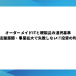 - オーダーメイドITと既製品の選択基準|多店舗展開・事業拡大で失敗しないIT投資の判断軸「手軽に導入できるパッケージソフトで十分か、それとも自社専用に開発すべきか」――IT投資を検討する経営者が最も… 続きを読む: オーダーメイドITと既製品の選択基準|多店舗展開・事業拡大で失敗しないIT投資の判断軸