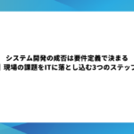- システム開発の成否は要件定義で決まる|現場の課題をITに落とし込む3つのステップ「システムを導入したのに、現場が使いにくいと言って結局使われなくなった」「開発が進むにつれてあれも必要・これも… 続きを読む: システム開発の成否は要件定義で決まる|現場の課題をITに落とし込む3つのステップ