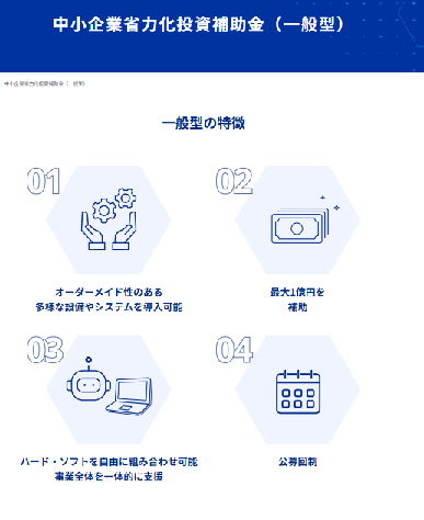 - 対象経費:オーダーメイドITシステム構築費、機械装置、専門家経費等